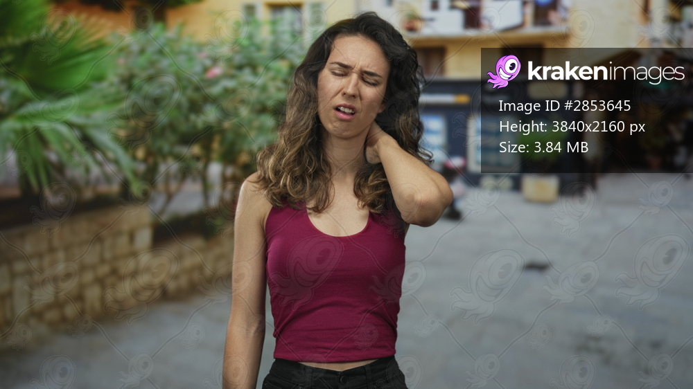 Woman in red tank top holding neck in urban street with pained expression and slight grimace; discomfort stress.
