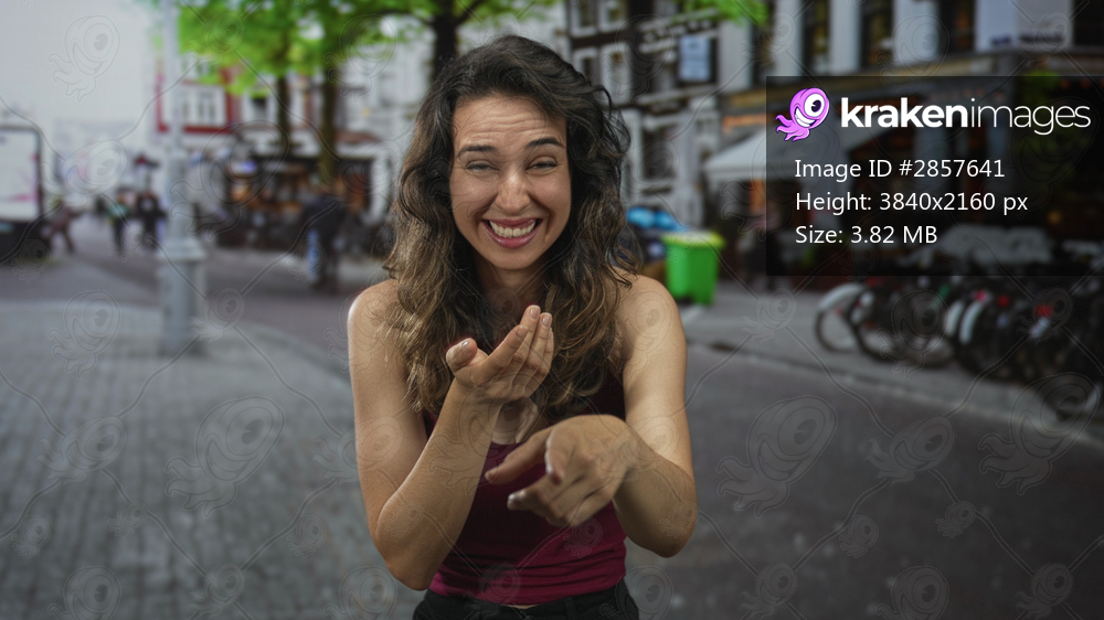 Woman in red tank top laughing and pointing finger on vibrant bustling cobblestone street at camera; joy.