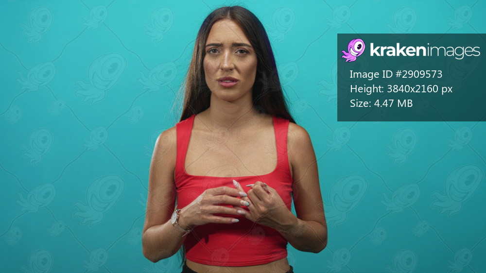 Woman in red tank top touching her fingernails and holding her hands near chest in studio with turquoise backdrop; uncertainty.