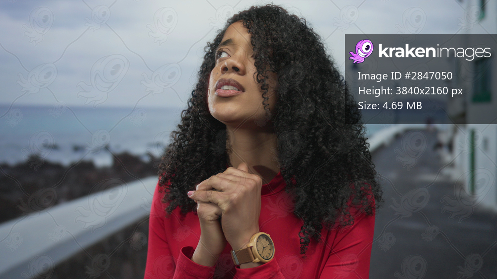 Woman in red top clasps hands at chest and gazes upward toward blue sea on seaside promenade; hope faith.