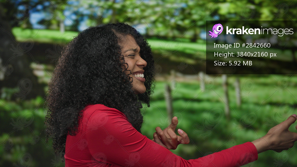Woman in red top with extended hand pulling rope gesture in forest clearing under bright sunlight; determination.
