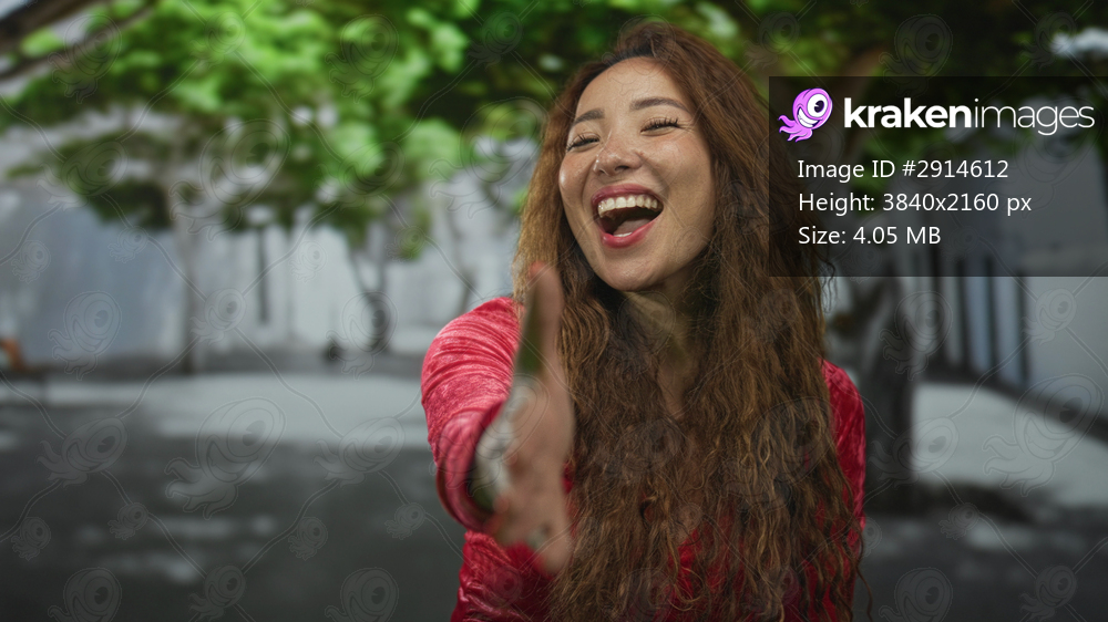 Woman in red top extends hand for handshake on street with leafy trees and concrete building behind her; friendly greeting welcome.