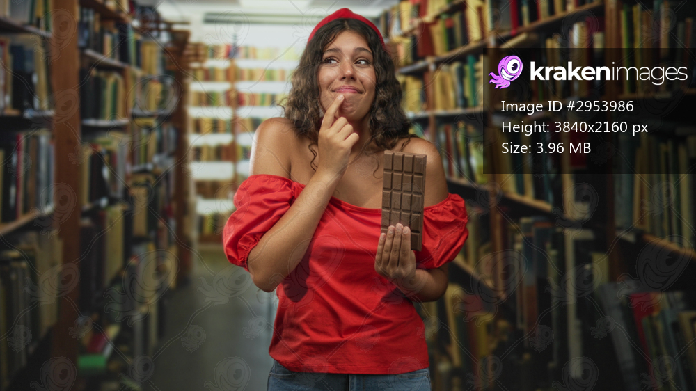 Woman in red top holding chocolate bar, fingers to mouth in building library aisle; temptation study break.