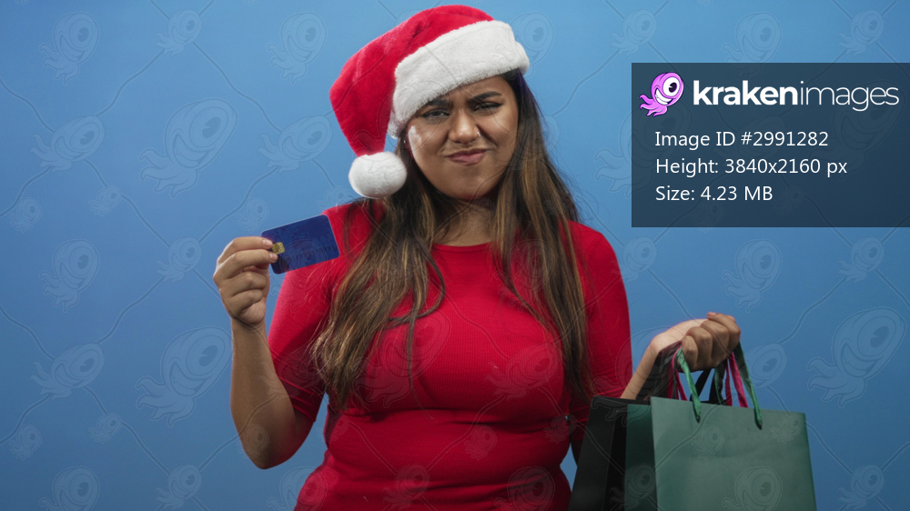 Woman in red top and santa hat holds creditcard in hand and shopping bags with a skeptical squint in studio; regret holiday shopping.