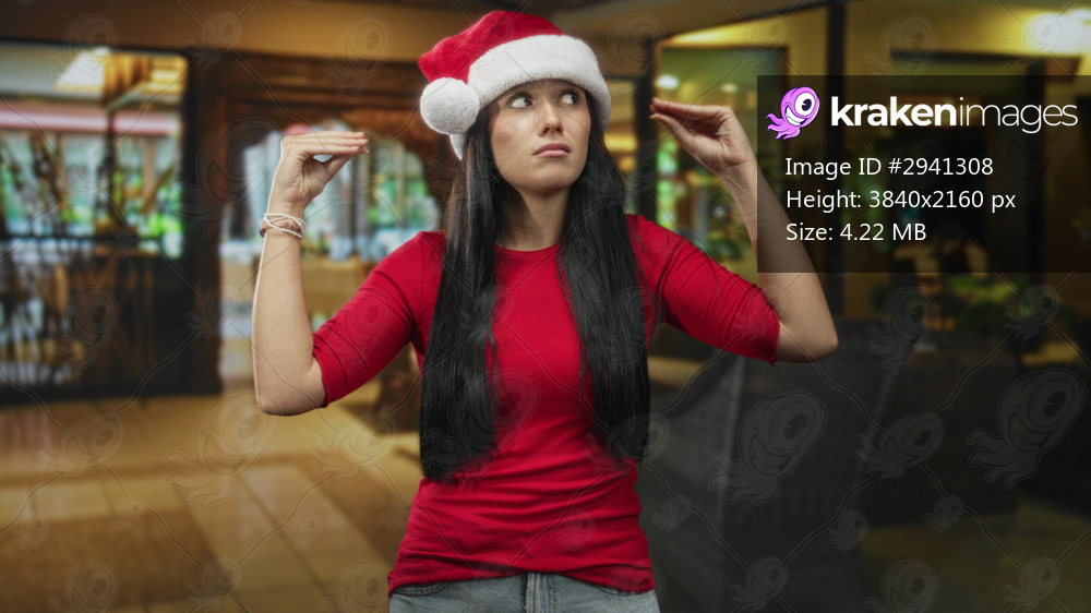 Woman in red top wearing santa hat pinching fingers gesture with grimacing face in building lobby surrounded by chairs and plants; holiday unease.