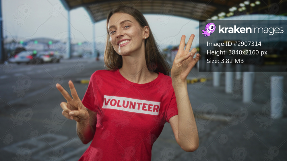 Woman in red tshirt showing peace sign with both hands raised at airport terminal curbside; volunteerism community joy.
