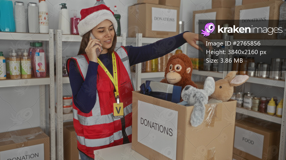 Woman in red vest and santa hat volunteering at charity donation center sorting toys and speaking on the phone in an indoor room filled with boxes and supplies. - Kraken Images