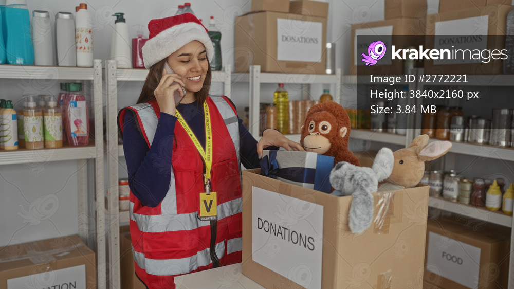 Woman in red vest and santa hat volunteering at charity donation center sorting toys and speaking on the phone in an indoor room filled with boxes and supplies. - Kraken Images