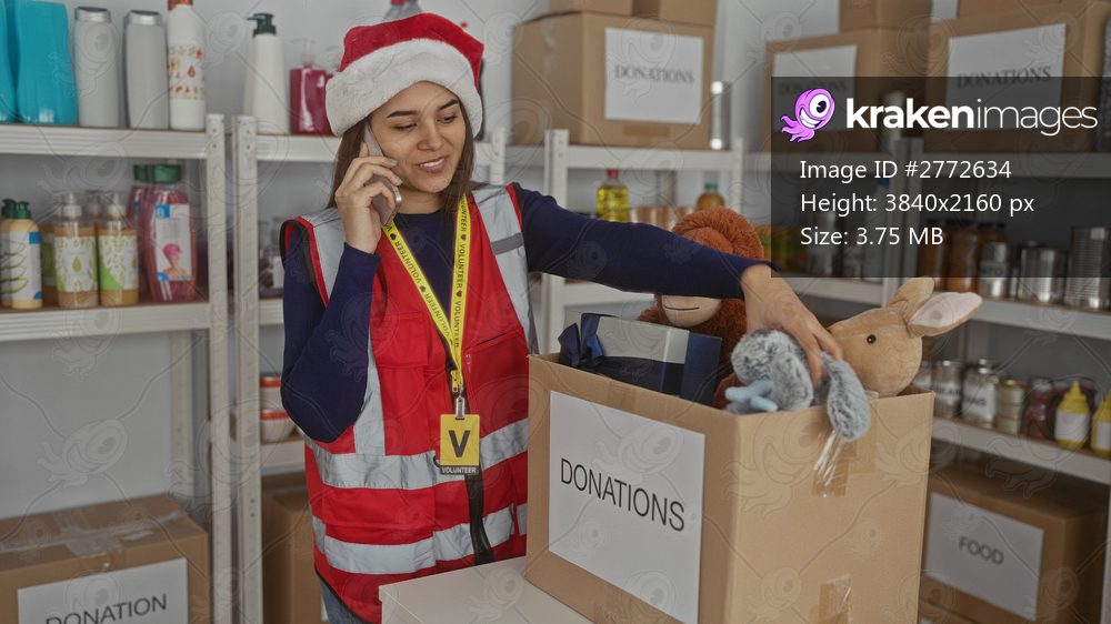 Woman in red vest and santa hat volunteering at charity donation center sorting toys and speaking on the phone in an indoor room filled with boxes and supplies. - Kraken Images