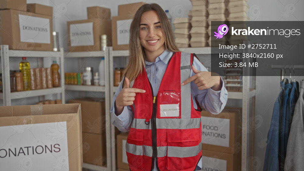 Woman in red vest volunteering at indoor charity donations center with shelves of food and supplies