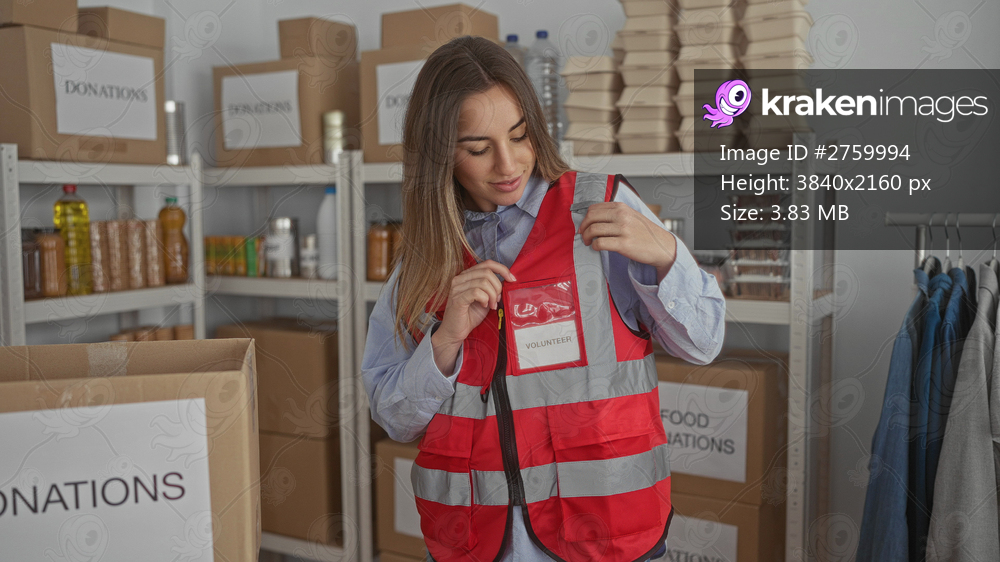 Woman in red vest volunteering at indoor charity donations center with shelves of food and supplies