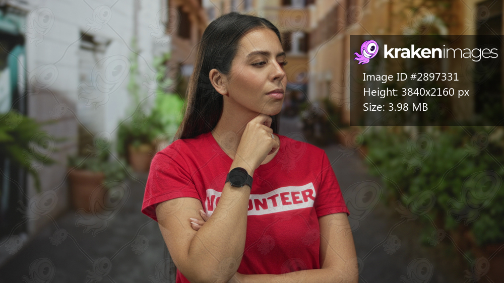 Woman in red volunteer shirt with hand on chin and crossed arm, pondering on a narrow street; thoughtful reflection.