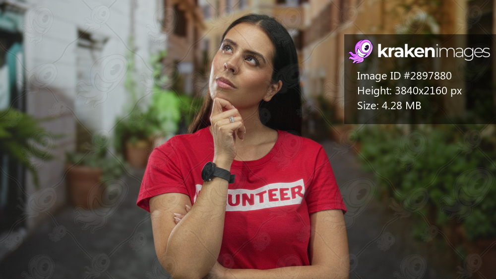 Woman in red volunteer shirt with hand on chin and crossed arm, pondering on a narrow street; thoughtful reflection.