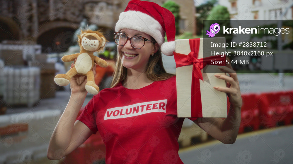 Woman in red volunteer shirt holding gift box and plush toy at a building construction site; generosity.