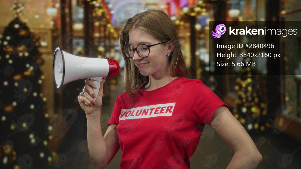 Woman in red volunteer shirt holds megaphone in building corridor decorated with holiday lights; community empowerment.