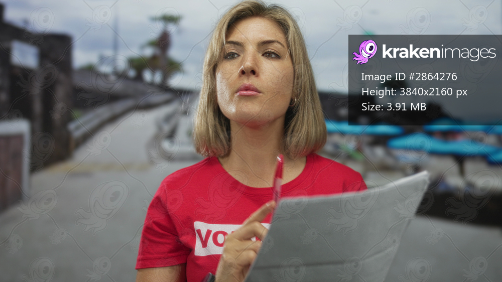 Woman in red volunteer shirt holds pen finger to lips on street by seaside with focused look; calm reflection.