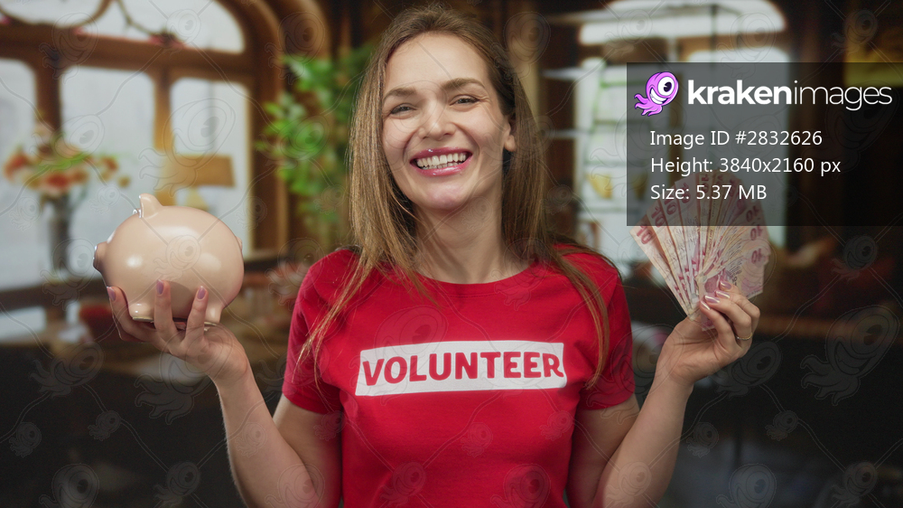 Woman in red volunteer shirt holds piggy bank and fans lira notes in building; donation charity generosity.