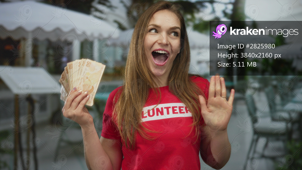 Woman in red volunteer shirt holds turkish lira banknotes at a street terrace café and pumps fist; celebration spirit. - Kraken Images