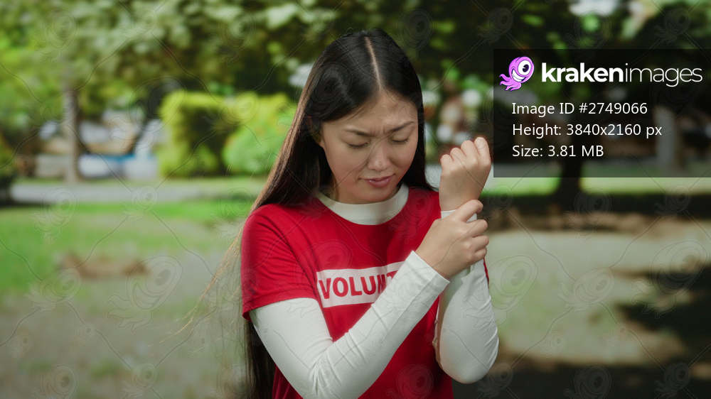Woman in red volunteer shirt holds wrist outdoors in sunny park with trees.