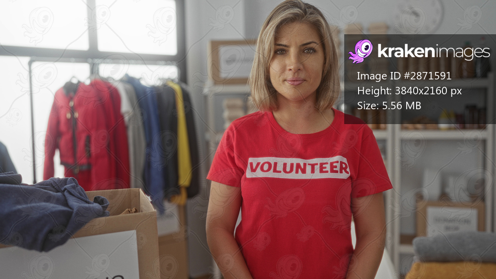 Woman in red volunteer shirt making heart shape with hands inside donation center building; support compassion.