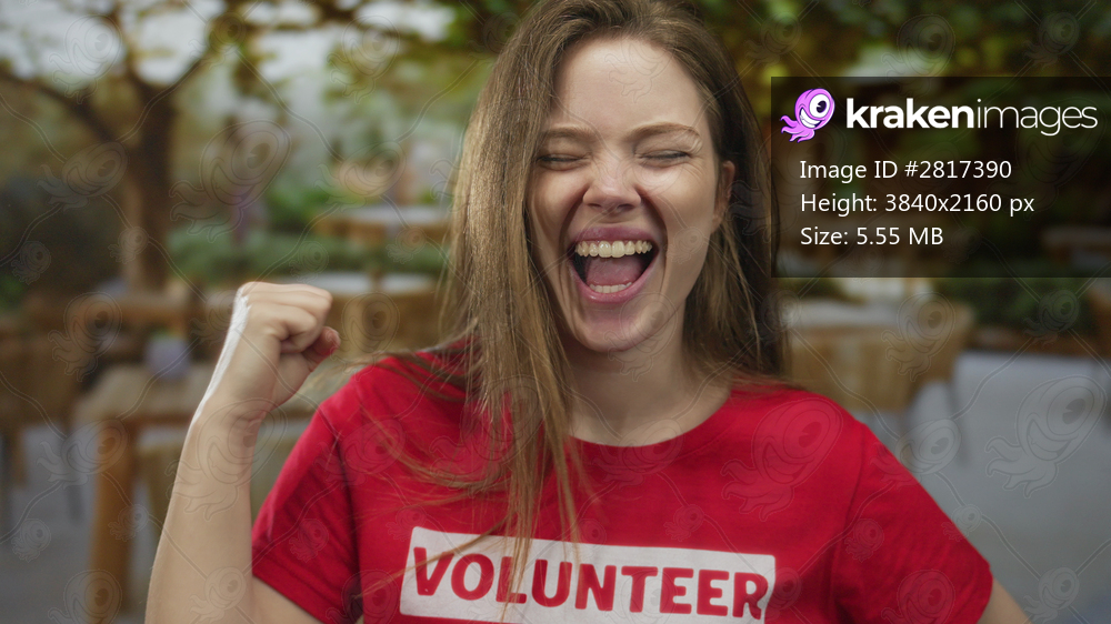 Woman in red volunteer shirt raises fist in victory and smiles broadly on terrace outside building amid wooden tables under sunlight; joy.