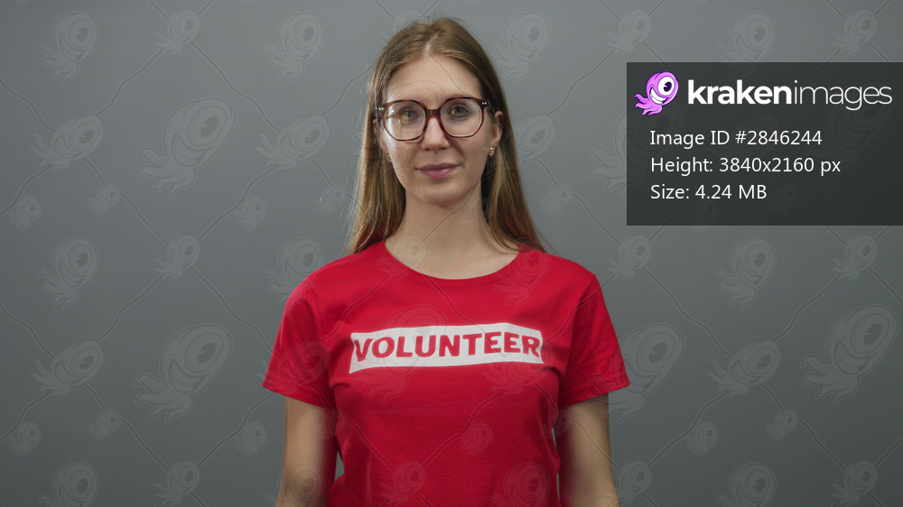 Woman in red volunteer shirt standing confidently with thumbs pointing to chest in a grey studio; pride.