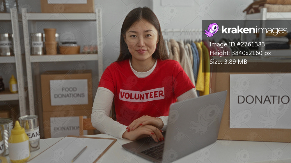Woman in red volunteer shirt works on laptop in donation center filled with boxes and clothing, highlighting charity and community aid efforts in indoor setting. - Kraken Images