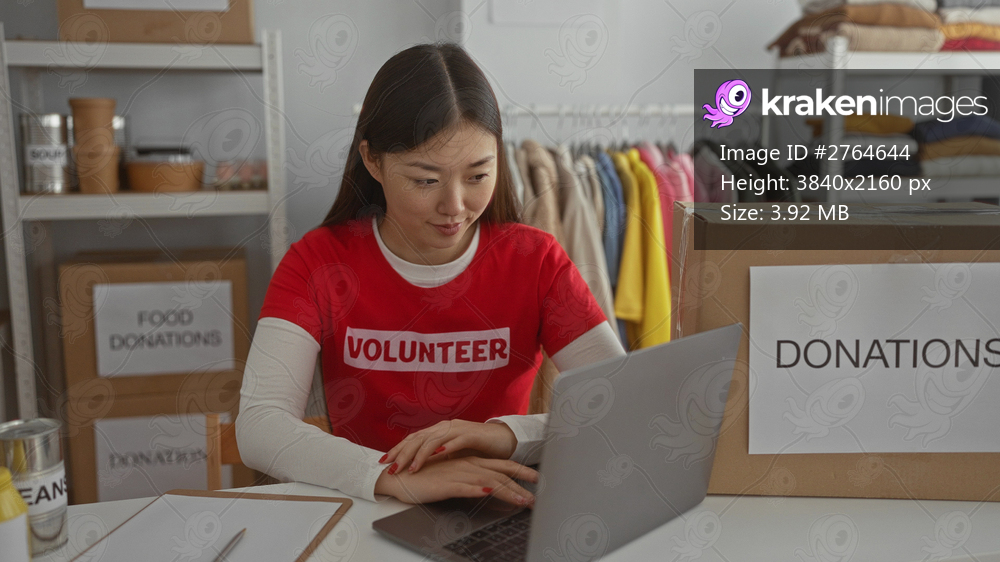 Woman in red volunteer shirt works on laptop in donation center filled with boxes and clothing, highlighting charity and community aid efforts in indoor setting. - Kraken Images