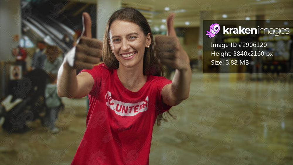 Woman in red volunteer tshirt gives double thumbs up at busy airport terminal while smiling and leaning forward to greet travelers; joy community service. - Kraken Images