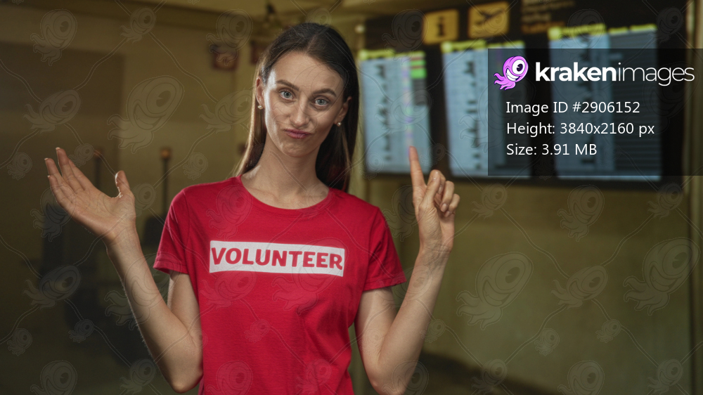 Woman in red volunteer tshirt with palms up shrug gesture at airport terminal display screen board; bemusement assistance.
