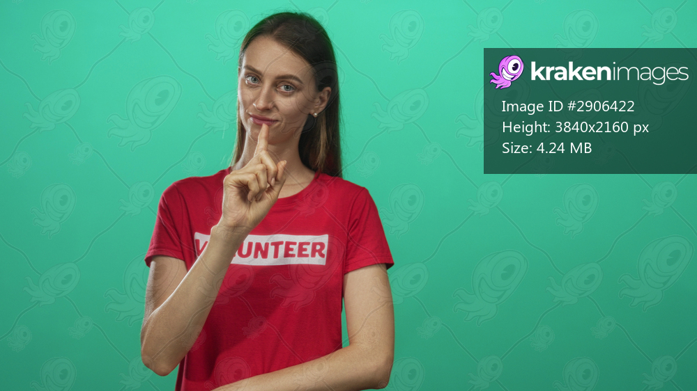 Woman in red volunteer tshirt, smiling, both hands raised with fingers pointing, posed in a green studio; community service confidence.