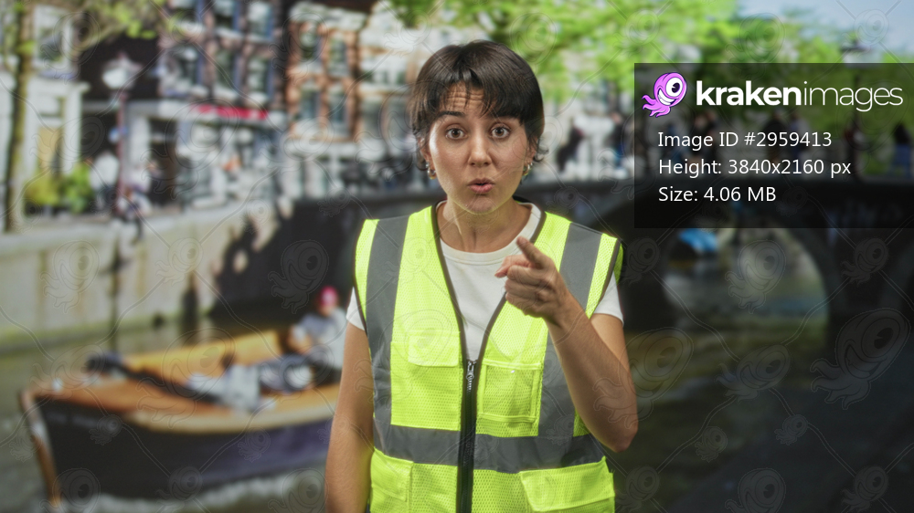 Woman in reflective safety vest points index finger and speaks on a street beside a canal and arched bridge with a boat nearby; concern.
