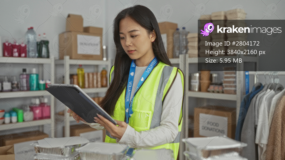 Woman in reflective vest at charity center inspects donations using tablet surrounded by supplies emphasizing volunteer spirit indoors.