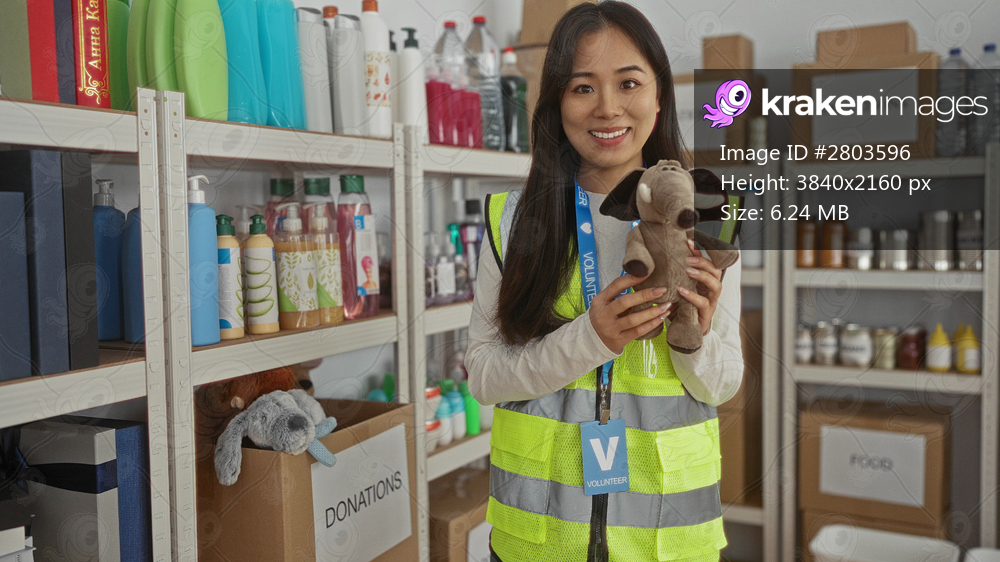 Woman in reflective vest holding stuffed animal in charity donation center filled with boxes and hygiene products, showcasing volunteer work in indoor setting. - Kraken Images