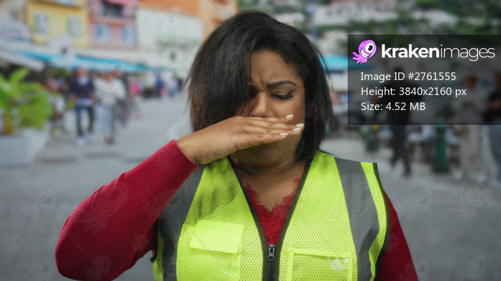 Woman in reflective vest sneezing on a bustling city street, showcasing urban outdoor setting with vibrant city life around.