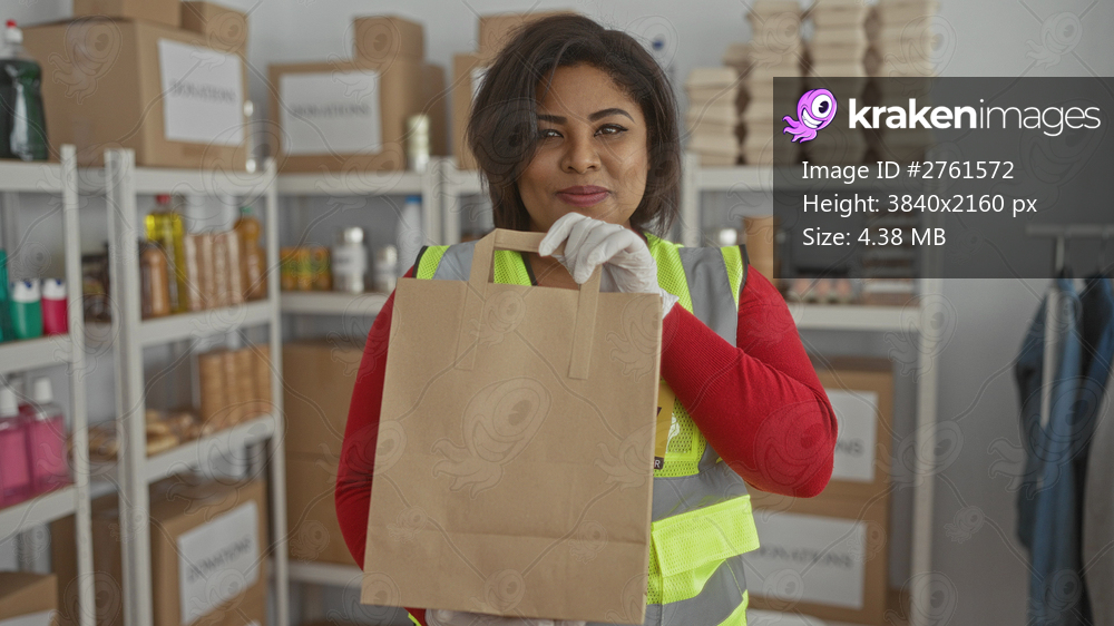 Woman in reflective vest volunteering by holding a paper bag in a donation center surrounded by shelves of supplies highlighting her dedication to charity work indoors. - Kraken Images