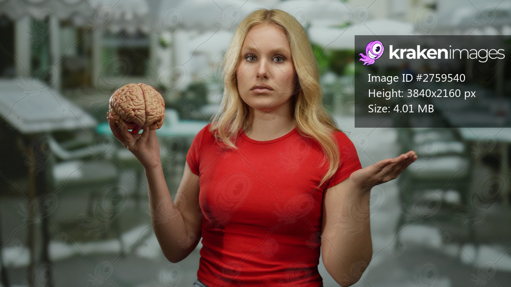 Woman in restaurant holding brain wearing red shirt with confused expression, surrounded by tables under white umbrellas.