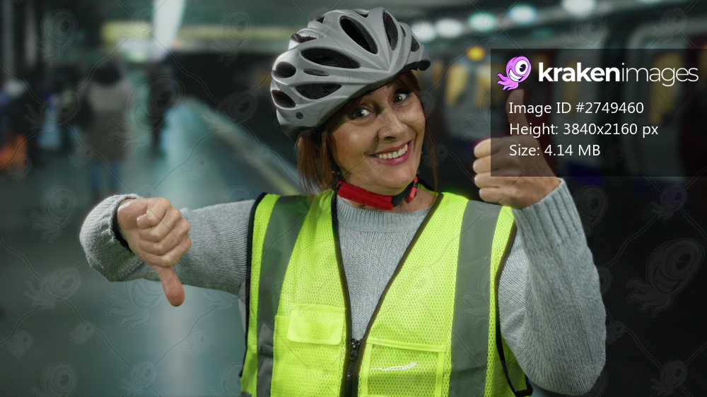 Woman in safety gear at a bustling train station gives a thumbs up and thumbs down while wearing a helmet inside the railway platform setting.