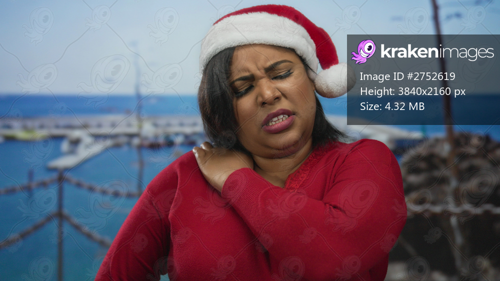 Woman in santa hat at seaside port feeling discomfort in red sweater during holiday.