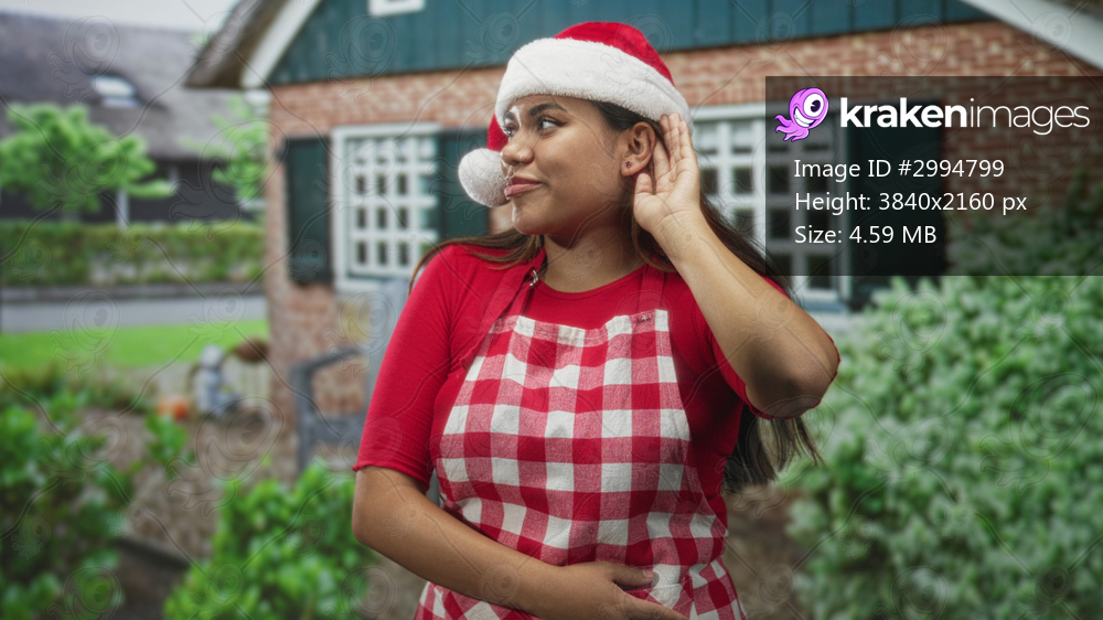 Woman in santa hat and checkered apron cups hand to ear outside a brick building while smiling and holding stomach; holiday joy.