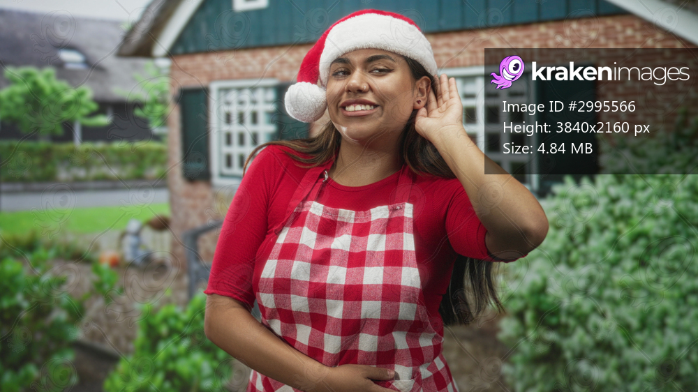 Woman in santa hat and checkered apron cups hand to ear outside a brick building while smiling and holding stomach; holiday joy.