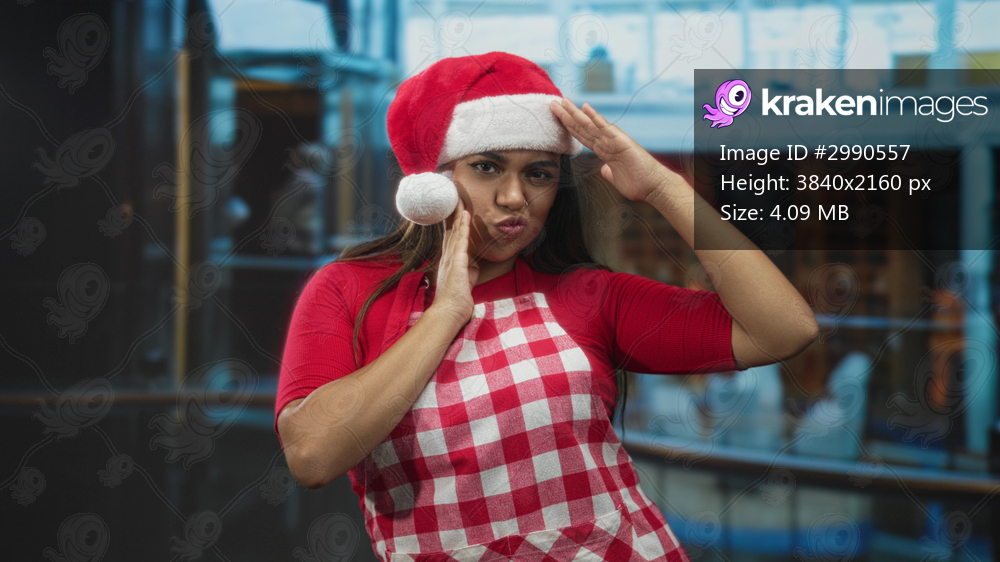 Woman in santa hat and checkered apron with hand to cheek and salute gesture in a building; festive cheer.