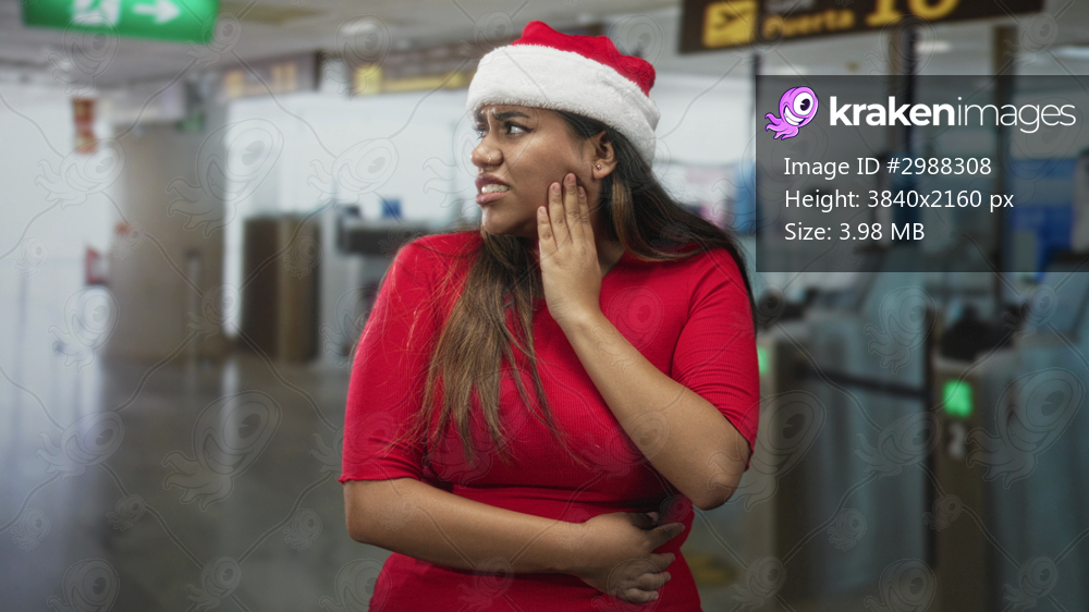 Woman in santa hat clutching herself and hand on cheek for toothache at airport security checkpoint; holiday travel distress.