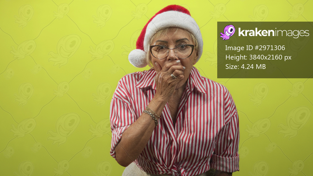 Woman in santa hat covers mouth with hand, wearing glasses and striped shirt in studio; surprise reflection.