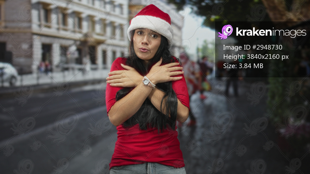 Woman in santa hat crosses arms hugging chest on street, visible wristwatch and red top with long hair; discomfort.