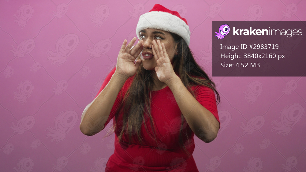 Woman in santa hat cups hands to mouth and gestures open palms, wearing red shirt in studio with pink backdrop; holiday joy.