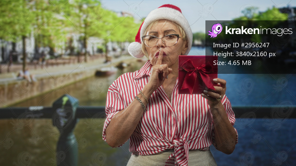 Woman in santa hat and glasses holds a red gift box, presses finger to lips for silence, wearing a striped shirt with bracelets on a street by a canal bridge; playful secret. - Kraken Images