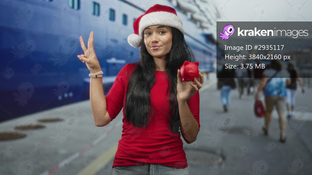Woman in santa hat holding a red piggybank and showing peace sign on street by a cruise ship pier; holiday saving joy.