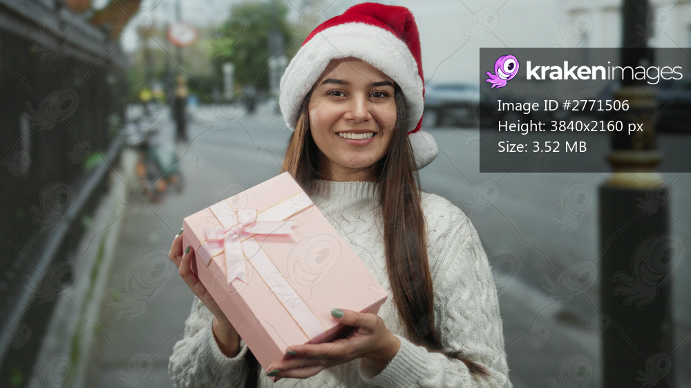 Woman in santa hat holding gift box on street in festive winter sweater, smiling with urban backdrop highlighting holiday spirit outdoors.