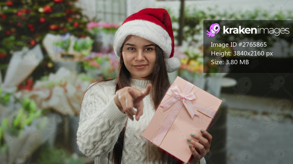 Woman in santa hat holding gift in flower shop gestures and smiles with flowers visible outdoors during festive season.